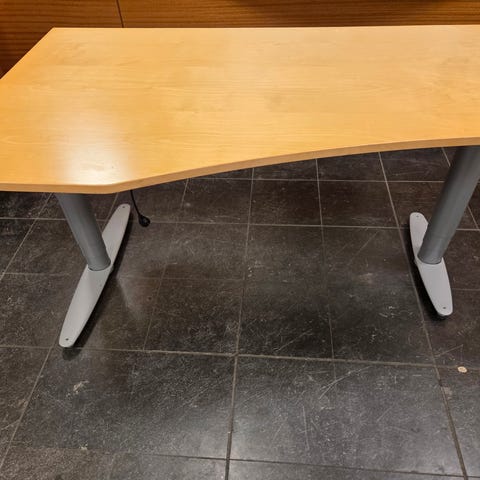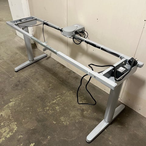 Höj och sänkbart skrivbord Elektrisk med måtten 200 cm i längd och 100 cm i bredd. Bordsskivan är grå och bordet har en stabil konstruktion. Passar för kontors- eller hemmabruk.