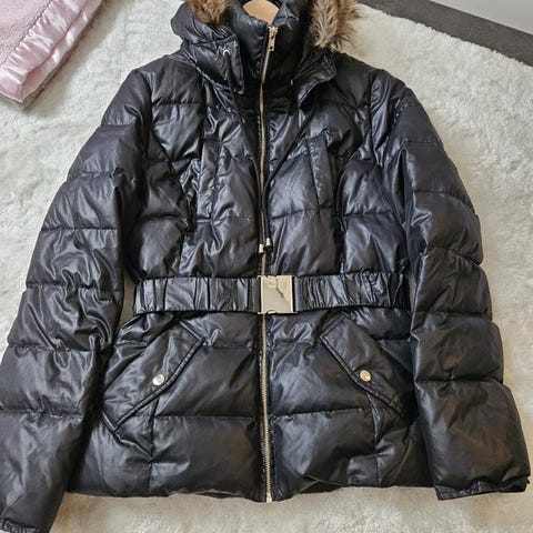 Vinterjacka i storlek S med svart färg och quiltad design. Jackan har dragkedjor fram och en huva med pälsimitation. Passar för kvinnor och är lämpad för kallare väder.