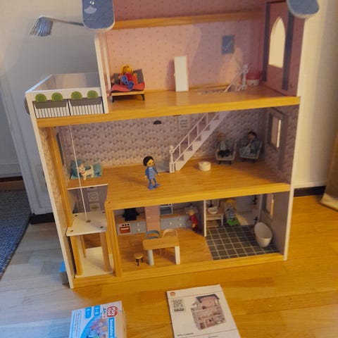 Dockhus med två våningar, inrett med möbler och inredning. Innehåller bland annat kök, vardagsrum och sovrum med detaljerad inredning. Passar som leksak för barn eller som samlarobjekt.