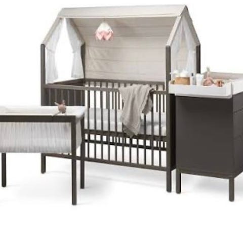 Stokke Spjälsäng i rund design tillverkad i trä med grå finish. Se länk för mått. I priset ingår madrass och lakan. Använd endast en kortare period.