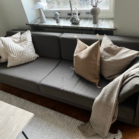 Soffan är använd och skulle må bra av en tvätt/uppfräschning, men är i övrigt i fint och stabilt skick. Klädseln är i ett ljust, neutralt tyg som passar de flesta hem.