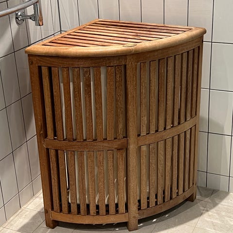 Tvättkorg med svart metallram och brun/frön påse i bomull/polyester. Korgen är hopfällbar för enkel förvaring och har två handtag för bärbarhet. Helt ny, felköp som inte passade hemma.