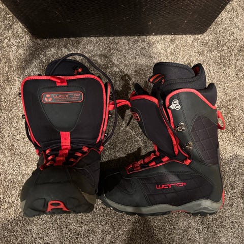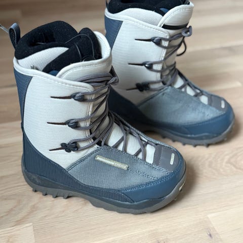 Skorna är använda men i helt ok skick, med normalt slitage. Inga trasiga sömmar eller större skador, fungerar som de ska och har bra passform och stabilitet för åkning i backen.