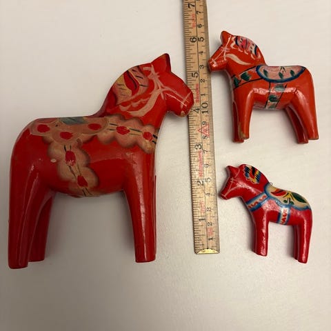 Dalahästar tillverkas i olika storlekar och färger, inklusive de traditionella röda och blå.