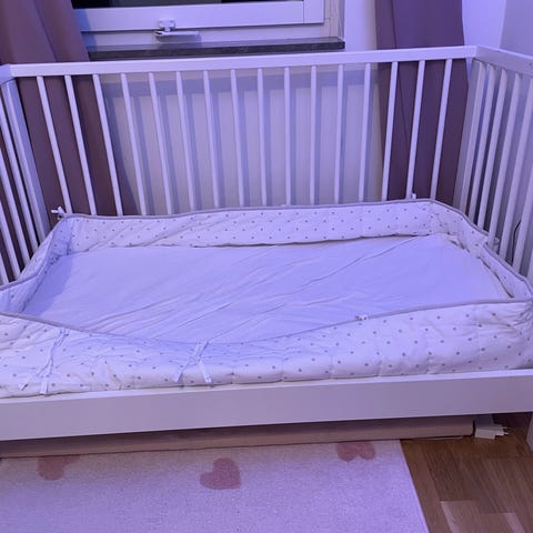 IKEA spjälsäng i vit färg. Mycket fin spjälsäng i bra skick. Hel och ren. Madrass och madrasskydd ingår. Även en extra bräda om du vill öppna ena sidan ingår. Önskas spjälskydd kan ni få med det också. 60x120cm