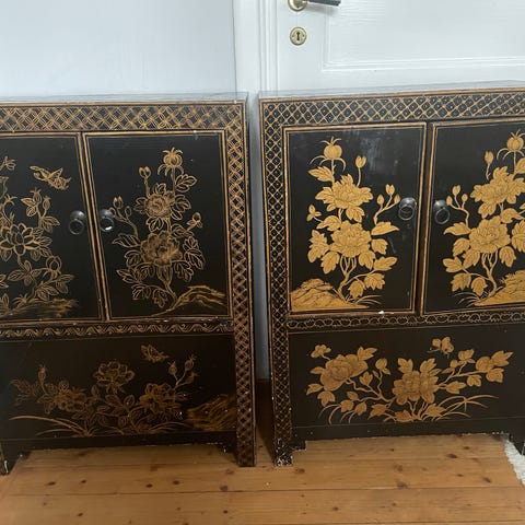 Två st antika och unika Kinesiska ” Horseshoe Chairs” i mycket fint skick. De kom till Sverige 1950 och har sedan dess varit i samma familj fram tills nyligen. Passar fint i allrum, hall .