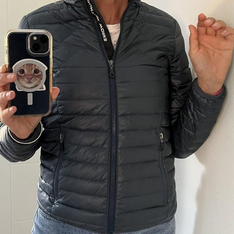 Ljusblå vadderad dunjacka med fast huva från HangTen. Jackan har dragkedja fram och en liten logotyp på bröstet.