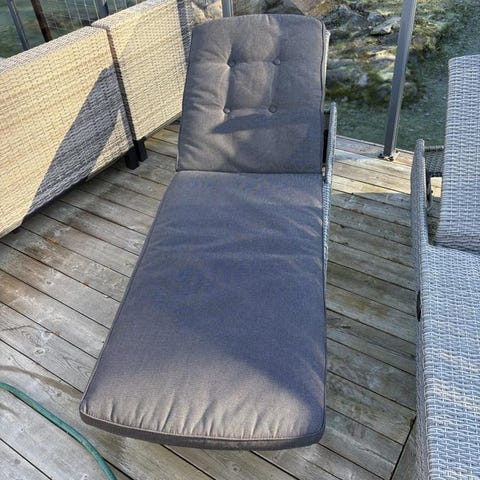 Solstol med grå dyna och träram. Stolens dyna är vadderad och klädd i grått tyg. Träramen har armstöd och en vilbar konstruktion. Passar för utomhusbruk på balkong eller terrass.