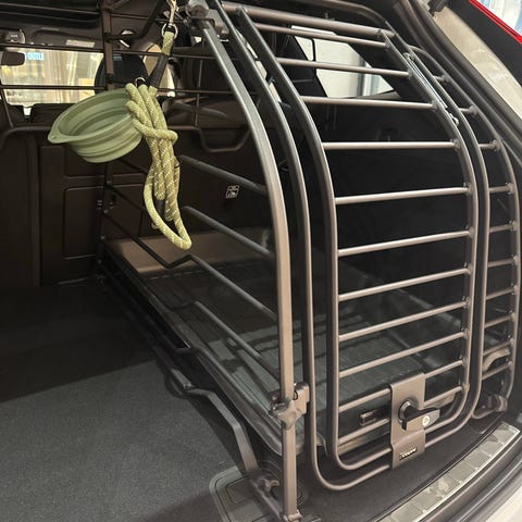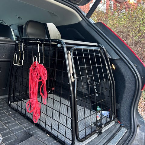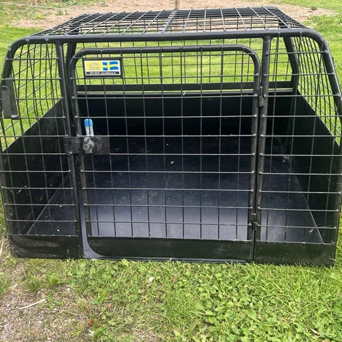 Metallbur för hundtransport i bilens bagageutrymme. Burens design delar utrymmet i två sektioner med galler för separation. Passar för att säkra hundar under bilresor och förhindrar att de rör sig fritt i bilen. Burens konstruktion är stabil och anpassad för att fästas i bilens inre delar. Kan användas med tillbehör som mattor eller kuddar för hundens komfort.
