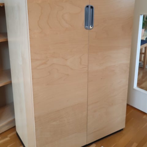 Skåp från Ikea med dörrar och medföljande sockel för benen som sitter på. Använt sparsamt och inga tydliga repor eller skador.