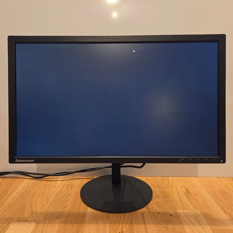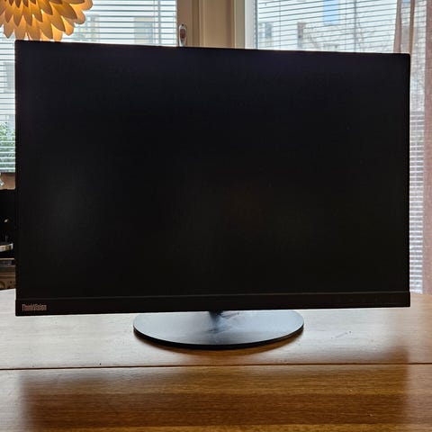 Lenovo ThinkVision bildskärm med en skärmstorlek på 24 tum. Skärmen är svart och har en justerbar fot för stabil placering på skrivbordet. Passar för allmän datoranvändning och kontorsarbete.