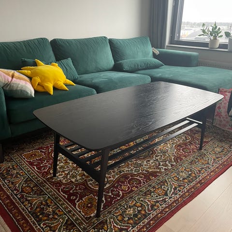 Soffbord med skiva i svartfärgat glas med underrede i svart metall. Tålig och lättskött skiva i härdat glas.
