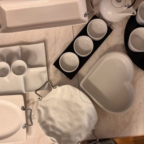 Limonges Paris porslin serveringsset bestående av flera delar med blommönster i olika färger. Setet inkluderar flera fat och skålar med dekorativa kanter och detaljer. Tillverkade i porslin med handmålade blommotiv. Passar för servering och dekoration.