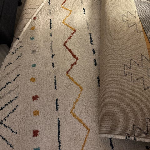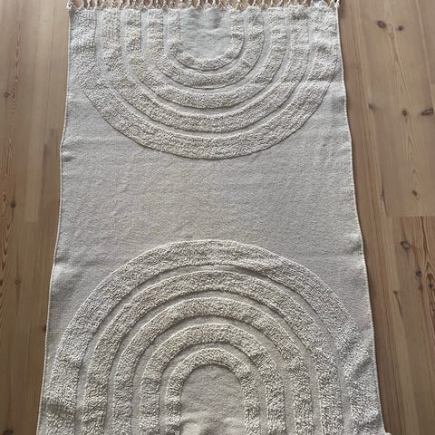 H&M Home matta i storlek 140x200 cm, tillverkad av bomull i beige färg. Mattan har ett dekorativt mönster och fransar på kortsidorna. Passar för användning som golvmatta i de flesta rum.
