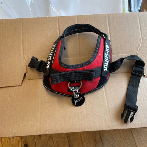 Säljer en neon gul sele som är väl använd men passar hundar upp till 30kg säljes för 40kr ska den skickas tillkommer frakt