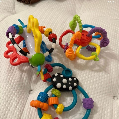 Done by Deer babymobil med mjuka figurer i olika former och färger samt en rund spegel.
