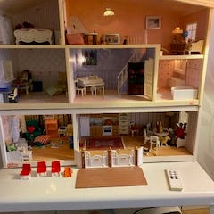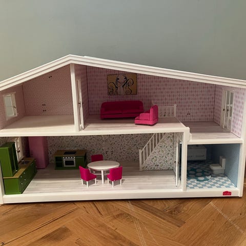 Lundby dockskåp med flera rum och inredning inklusive soffa, fåtölj och bord. Passar som leksak för barn.