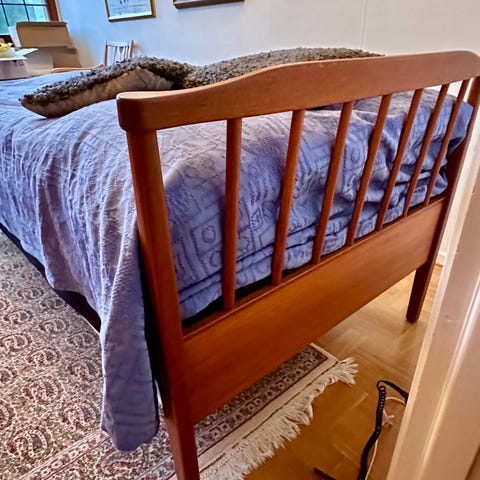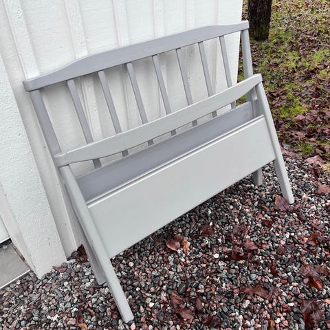 Ommålade sänggavlar från Carl Malmsten med passande 90 cm resårbotten från IKEA. Färgen har släppt på sina ställen.