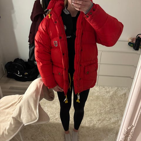 Fjällräven dunjacka i blå färg, storlek S. Använt skick. Finns ett litet hål på ena ärmen som knappt syns!
