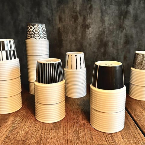Rörstrand Filippa K kaffemuggar 8 stycken. Muggarna har en vit överdel med horisontella räfflor och en svartvit randig undersida. Designad för att användas som kaffemuggar.