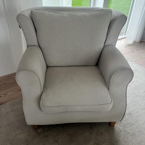 Fåtölj och fotpall i mörkgrått tyg (Jysk Tankedal)