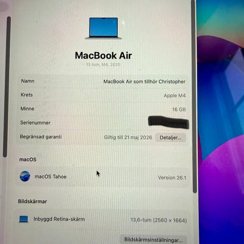 Säljer en MacBook Air M3 med 16 GB RAM och 512 GB lagring. Datorn är knappt använd och i mycket fint skick – helt fri från repor eller skador, inklusive skärmen. Den är varsamt hanterad och det framgår tydligt på bilderna. Batterihälsan är 100 % och den har endast 11 laddningscykler. Köpt november 2024.