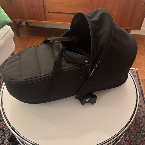 Barnvagnen är fullt fungerande och i gott skick, bortsett från en spricka i handtaget. Detta kan enkelt åtgärdas genom att beställa ett nytt handtag, exempelvis från Temu för ca 25–50 kr.