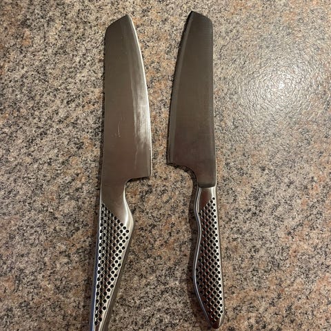 Kockkniv samt grönsakskniv hade mått bra av att lämnas iväg på slipning, i övrigt sparsamt använt och i bra skick.