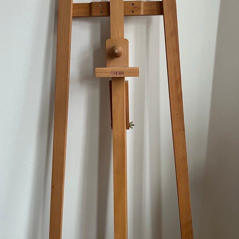 Beckers staffli i trä, från mitten av 1900-talet, mått cirka 205 cm x 65 cm. Justerbar höjd och vinkling med kedja för stabilitet.