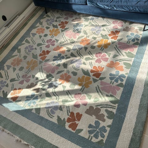 Säljer en fin ullmatta i vinröd färg med dekorativt blommönster i blått, grönt, gult och vitt. Mjuk och skön kvalitet som ger ett varmt intryck i rummet.