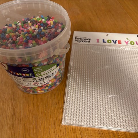 Hama Pärlplattor och pärlor för barn inklusive pärlplattor, en burk med 16000 pärlor samt tillbehör för att skapa pärlplattor. Produkten är avsedd för barn och används för pyssel och kreativ lek.