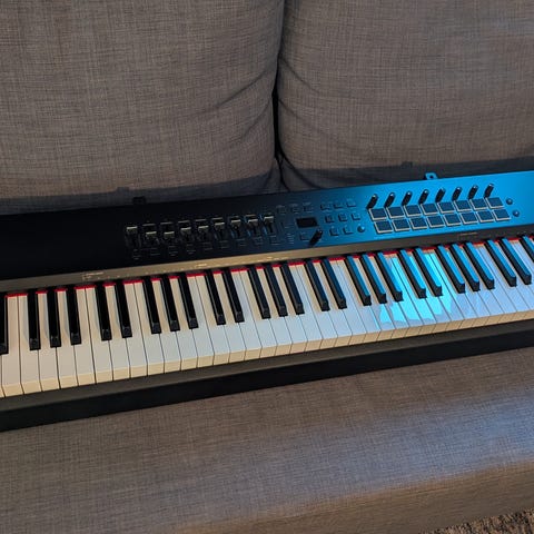 Professionellt MIDI-keyboard med 88 vägda hammartangenter och mycket realistisk pianokänsla. Aftertouch, RGB-pads, faders och rattar ger full kontroll i studio eller live. Perfekt för både pianister och producenter. Sparsamt använt och fullt fungerande. Stativ och notställ ingår. Endast avhämtning.