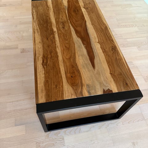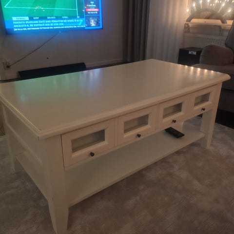 Tungt och elegant soffbord med fina detaljer. Kommer ifrån Engelska möbelhuset och har plats för böcker, spel och fjällkontroller på undervåningen. Om man tittar nära behöver det behandlas på ett ställe (se sista bilden) men det syns inte håll. Värderades till 1000 kr av Bukowskis i det skick det är nu