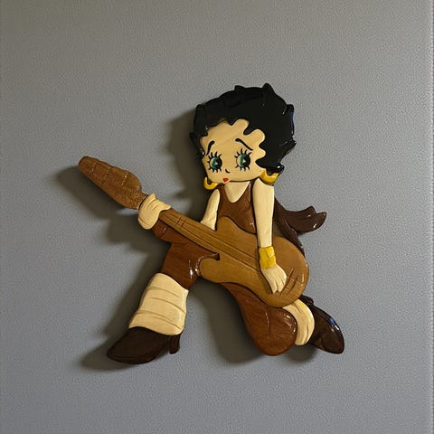 Tavla i trä med motiv av Betty Boop gående med en hund. En stilren inredningsdetalj som passar både hem och arbetsmiljö. På baksidan finns en upphängningskrok.