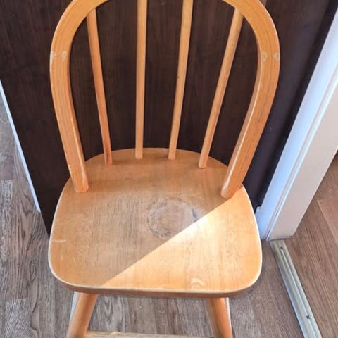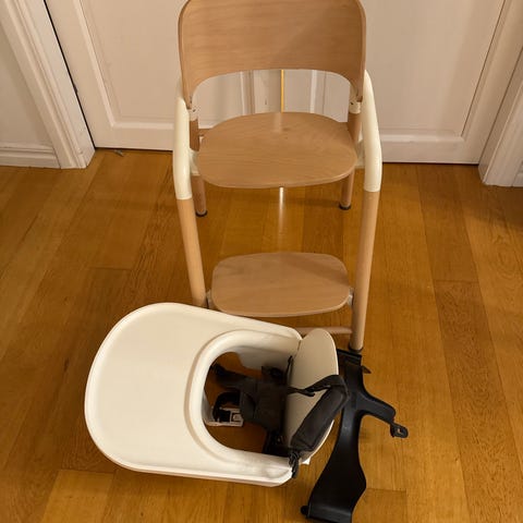 En unik barnstol från Danmark märket är okänt. Fotstödet är flyttbart. Stolen behöver lite omvårdnad men fullt användbar och med friskt trä..