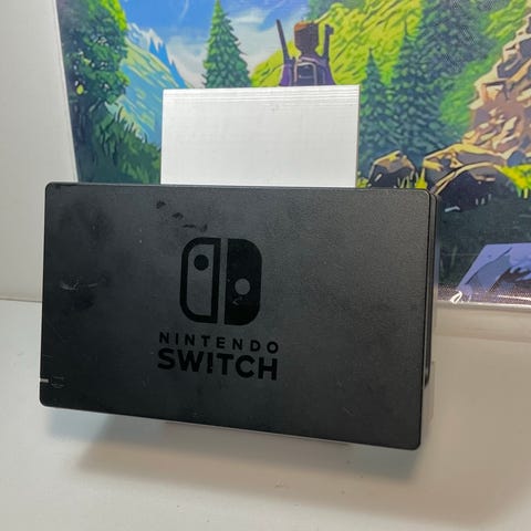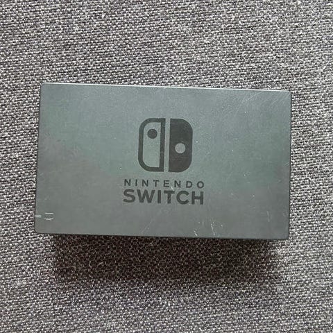 Nintendo Switch Dockningsstation med tillhörande HDMI-kabel och strömadapter. Används för att ansluta Nintendo Switch-konsolen till TV eller extern skärm för spel i större format.