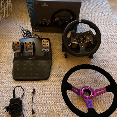 Logitech G920 ratt och pedaler för Xbox/PC med tre pedaler och växelspak. Svart färg och material i läderliknande yta på ratten. Designad för racing- och körsimulatorer.