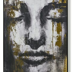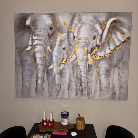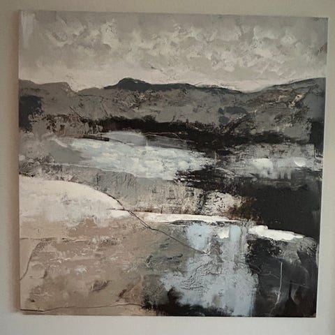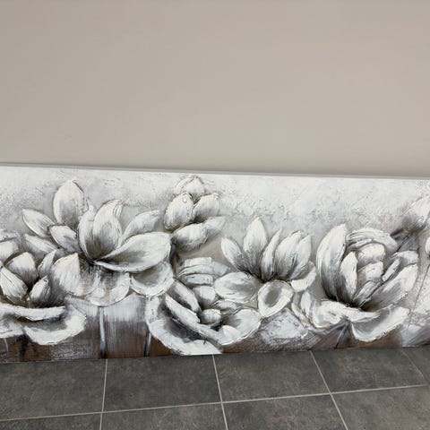 Mio tavla med abstrakt bladmotiv i färgerna orange och blå, inramad med svart ram.