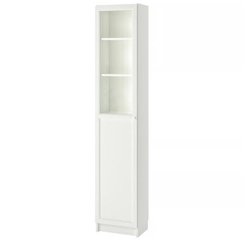 Säljer två identiska exemplar av BILLY / OXBERG bokhylla med glasdörr i brun (valnötsmönstrad) trästruktur.
