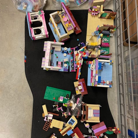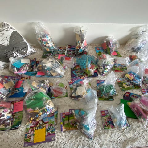 LEGO Friends byggsats med flera delar inklusive minifigurer, tillbehör och bygginstruktioner. Setet innehåller färgglada komponenter och är utformat för kreativ lek och konstruktion.