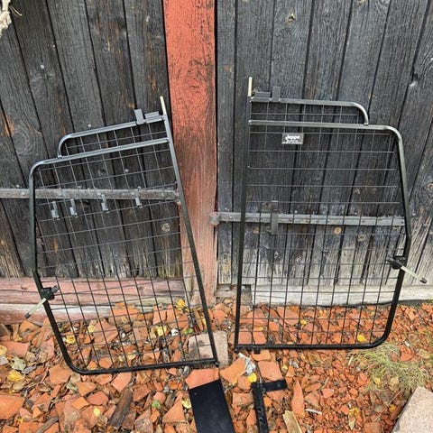 Barnsäker grind i svart metall. Grinden är flexibel och kan anpassas för att passa olika öppningar och rum. Det ingår två fästen till vägg. Varje del är ca 65 cm bred.
