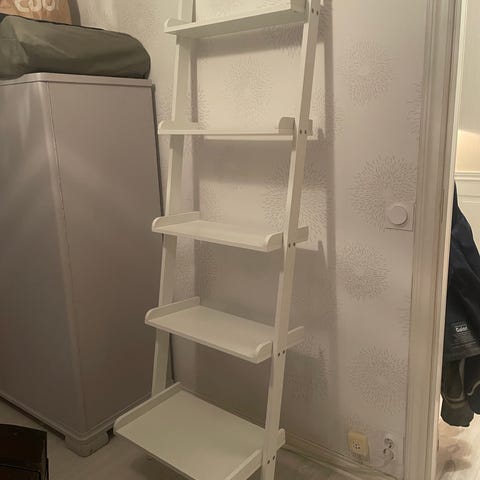 Praktisk steghylla. 5 hyllor. Översta hyllan är 15 cm djup. Nedersta är 35 cm djup. Den är i i nyskick. Höjden är 1,75