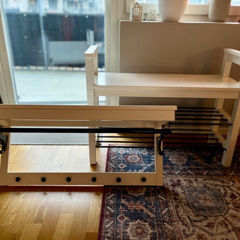 Stilren och funktionell hallmöbel i form av en hallbänk med inbyggd skohylla. Perfekt för hallen där du enkelt kan sitta ner och ta på dig skorna samtidigt som skorna förvaras prydligt under bänken.