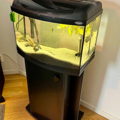Stilrent akvarium perfekt för aquascaping. Säljs tomt med möbel utan filter pga har köpt ett större. Om det säljs snabbt följer det med massa växter om man vill.