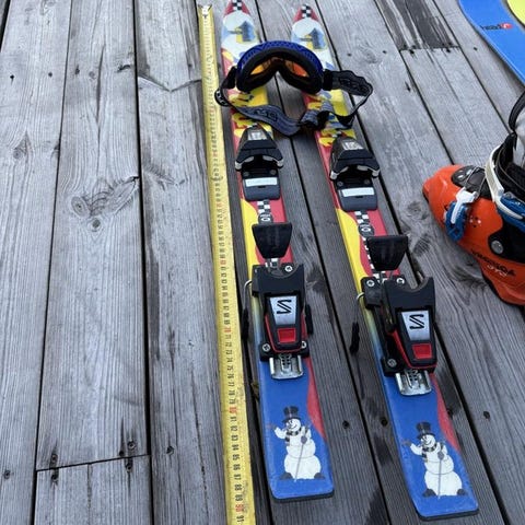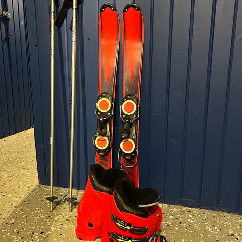 Säljer ett paket med skidor, stavar, pjäxor och hjälm. Skick och storlekar enligt bilder.