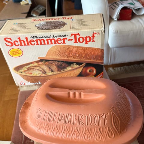 &Tradition koppargryta med lock och matchande serveringsfat. Grytan har handtag på sidorna och är tillverkad i koppar med en hamrad yta. Serveringsfaten är runda med dekorativa kanter och fötter, också i koppar med insida i silverfärgad metall. Setet är avsett för köksanvändning och servering.