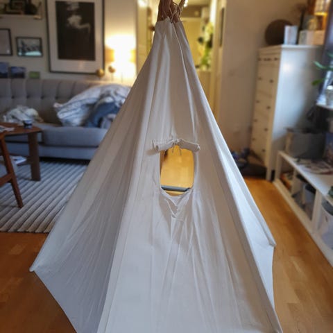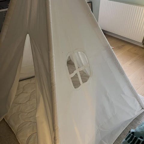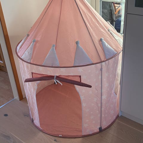 Barnlek tält i rosa och vitt med stjärnmönster. Tältet har en dörröppning och är tillverkat av lätt material som passar för inomhuslek.