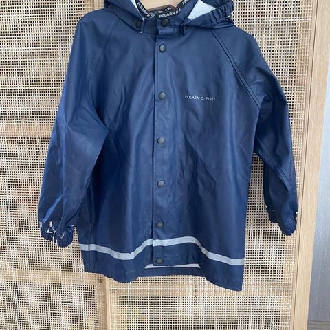 Klassisk regnjacka för barn med justerbar huva, slitstarkt PU-tyg och praktiska tryckknappar för enkel användning. Från Tretorn. Strl 128/134.