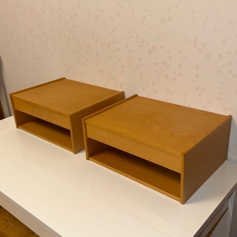 Slitage förekommer i form av repor, märken och fläckar, särskilt synliga på sidor och baksida. Extra hål för att flytta hyllorna. Inga strukturella skador noterade, stabil.