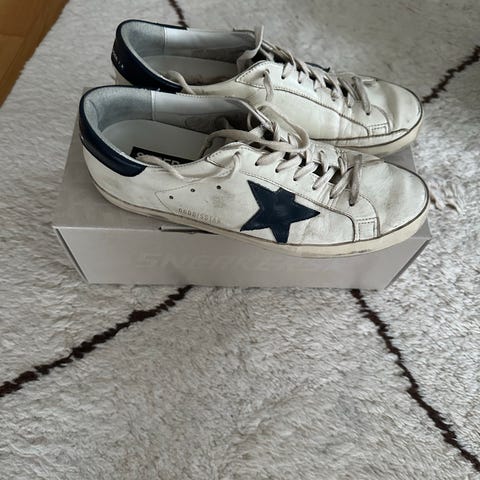 Säljer ett par Golden goose skor i den efertraktade färgen navy & white. Nypris 4800kr, storlek 40 men sitter lite större så passar mer som 41. Ingår: Kvitto, orginalbox, dustbag och GG passport vid köp. Finns slitningar på hälen. Jag erbjuder gratis frakt vid köp :)